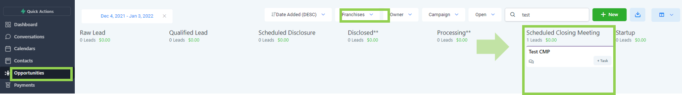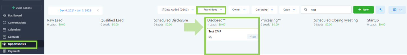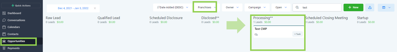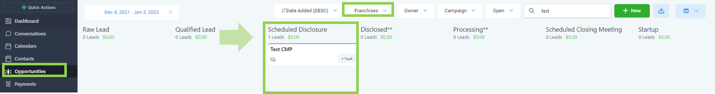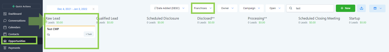 Leads are automatically added into the raw stage coming from various lead channels such as but not limited to Franchise Opt-in form fills, Facebook ads, and Google ads.