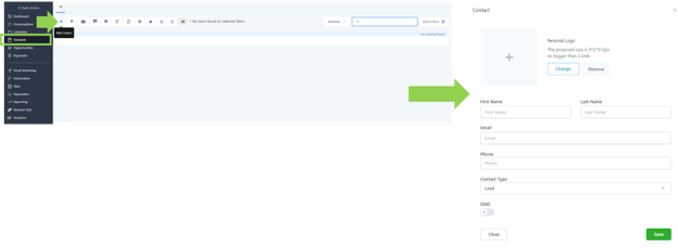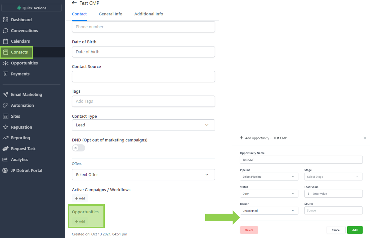 To create an opportunity manually, go to contacts, select the lead you wish to add to the opportunity pipeline, and click “Add” under the Opportunities field.
