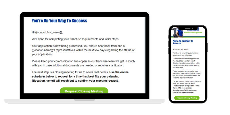 A system-generated email is sent to leads on the “Processing” Stage to update the prospective client regarding the status of their application along with an invitation to request for a Closing Meeting.